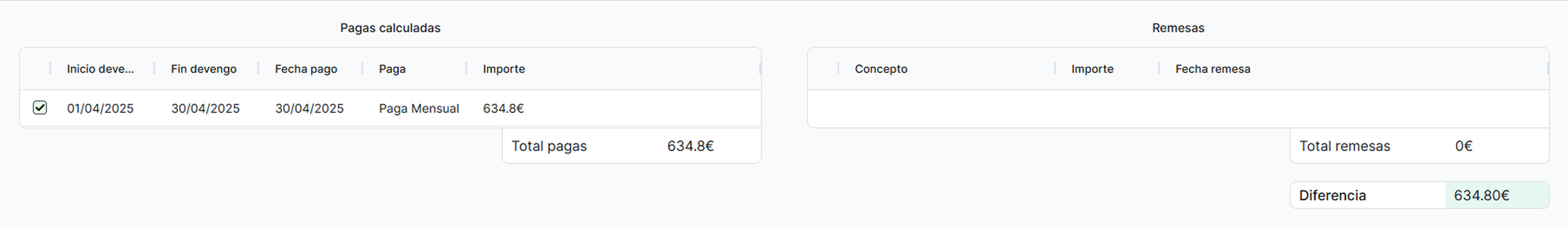 Verás una tabla con todos los cálculos de nómina y otra con las remesas asociadas.
